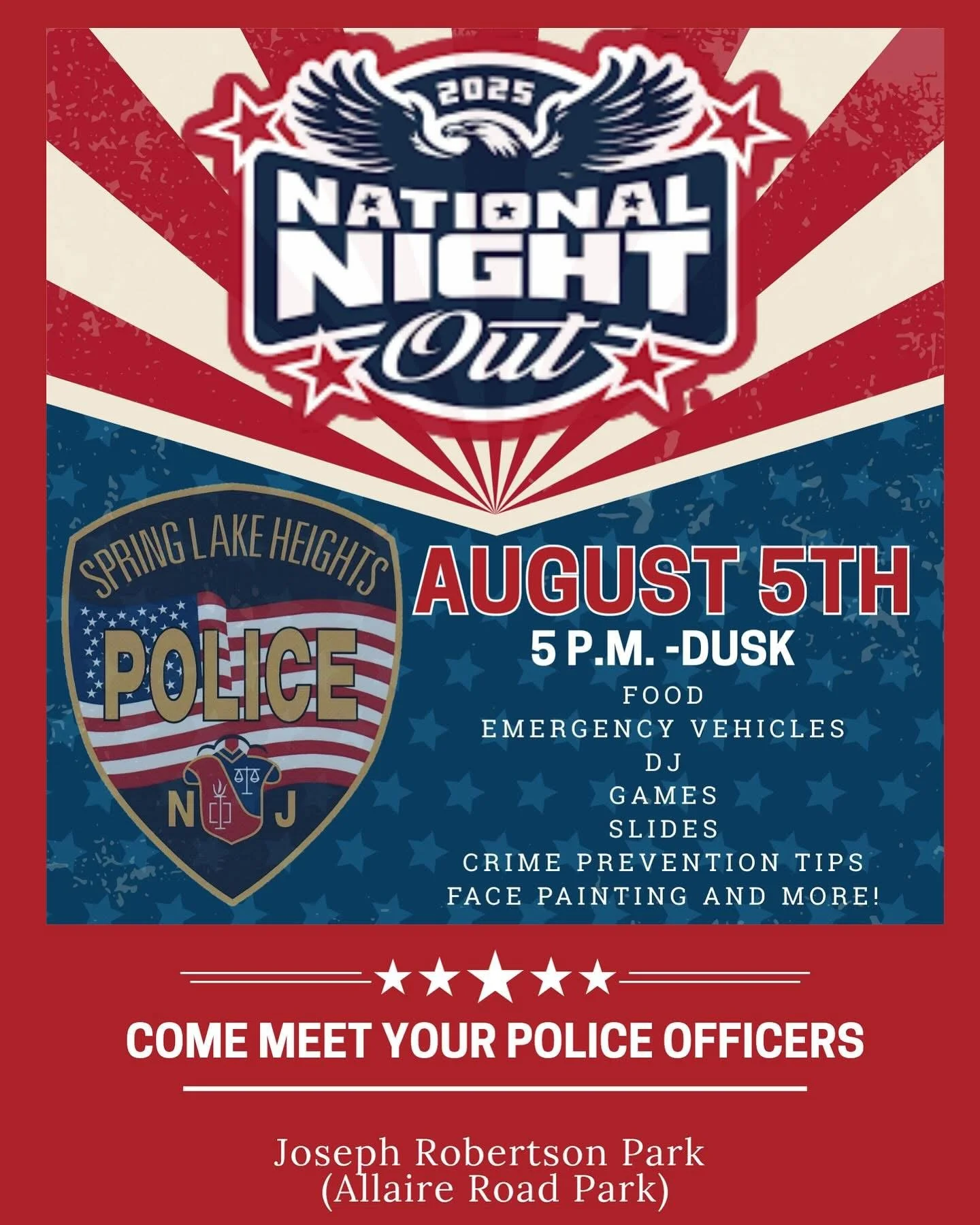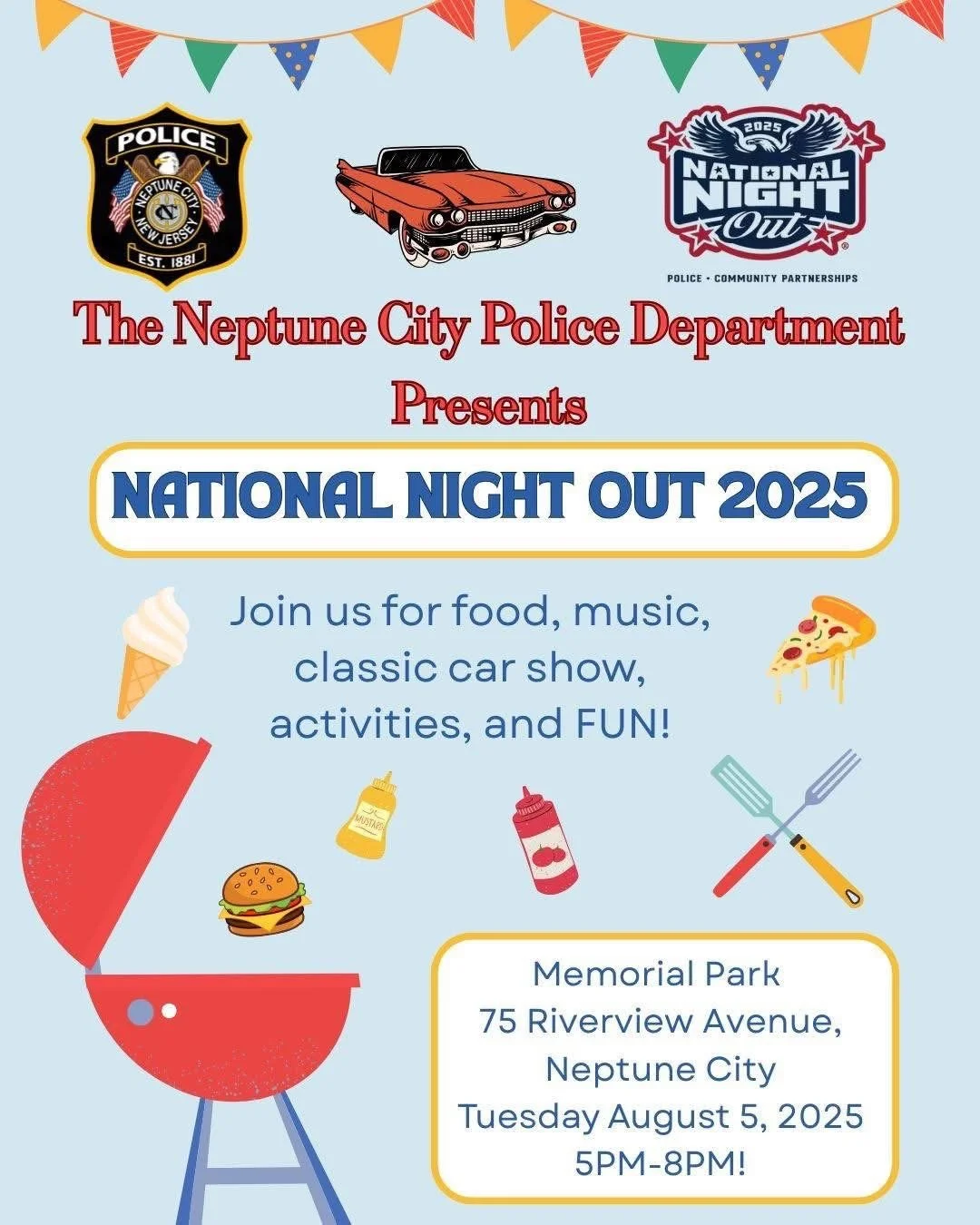 Aug 5 Neptune National Night Out 2025 Tuesday, August 5, 2025 5:00 PM 8:00 PM Memorial Park (map) Google Calendar ICS View Event →
